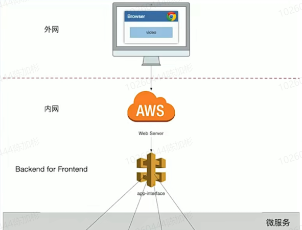 移动端 -> API Gateway -> BFF -> Mircoservice,在FE Web 业务中,BFF 可以是 nodejs 来做服务端渲染(SSR, Server-Side Rendering), 注意这里忽略了上游的 CDN、4/7层负载均衡(ELB)