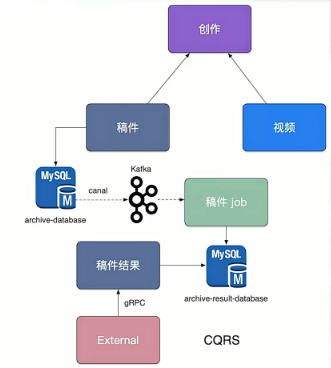 在稿件服务演进过程中,我们发现围绕着创作稿件、审核稿件,最终发布稿件有大量的逻辑揉在一块,其中稿件本身的状态也非常多种,但是最终前台用户只关注稿件能否查看,我们依赖稿件数据库 binlog 以及订阅 binlog 的中间件 canal,将我们的稿件结果发部到消息队列kafka中,最终消费数据独立组件一个稿件查询结果数据,并对外提供一个独立查询服务,来拆分复杂架构和业务。