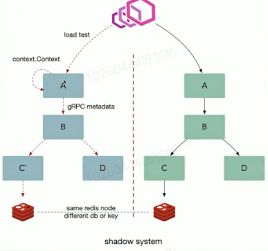 - 影子系统一般用于全链路压测,因为你知道全链路压测在线上压测,你肯定期望不影响能检验生产环境,但是又不影响生产环境,你希望一套完整的测试环境能够虚拟出来,压的是线上的资源,但是又不影响在线的业务。